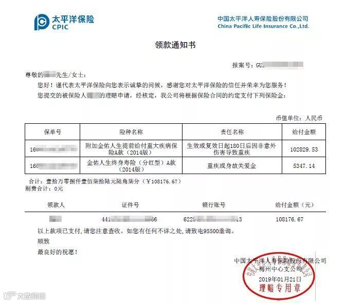 最终,2014年在机缘巧合下认识了我司业务主任李美招,经李主任推介投保了我司的10份金佑人生终身寿险(分红型)A款(2014版),附加金佑人生提前给付重大疾病保险,年缴保费6450元,重疾保额10万元。