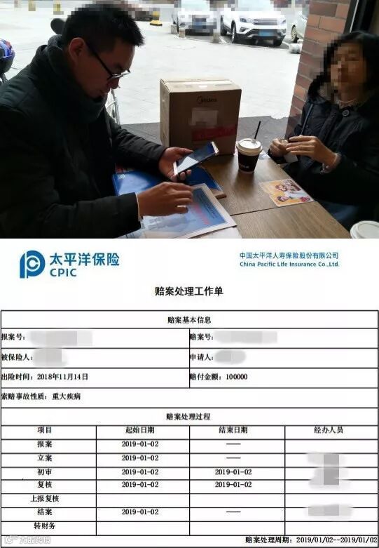 2019年1月2日早上,余经理陪同林女士将打印好的病案资料通过“太e赔”进行拍扫上传,就在当天下午,合计10万元的癌症理赔金就顺利划账到林女士的账户中。