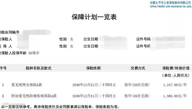 但是,到了她这个年纪购买重疾保险,对于经济条件并不算优越的她来说,也是一笔不少的开支。她也一度对重疾保险望而却步,直到她遇到我司的一名业务员。在和对方交流后,业务人员根据她的个人需求及经济条件,向她推荐了我司的爱无忧两全保险A款,附加爱无忧防癌疾病保险A款的保障计划。虽然防癌险的保障并没有重疾保险全面,但对于林女士来说也是不错的选择。她也非常认同,在2016年12月底,花了2615元为自己配置了一份防癌险。