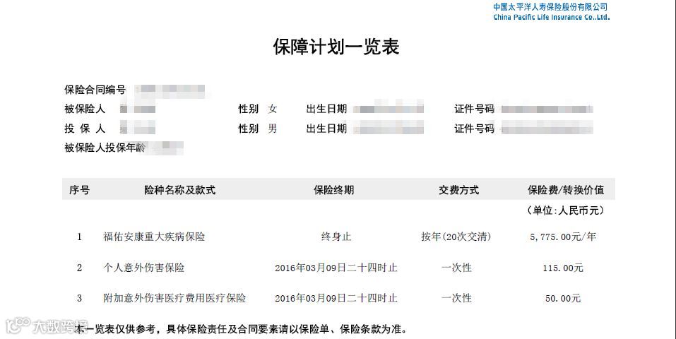在他推荐下,陈先生为自己投保了两全险、意外险和防癌险,并建议他在经济条件允许下,为自己和家人配置更全面的保障。陈先生非常认同廖经理的专业分析,在2015年3月10日,也为自己的妻子李女士(化名)投保了“福佑安康重大疾病保险,个人意外伤害保险,附加意外伤害医疗费用医疗保险”的重疾+意外的保障方案,其中重疾保额150000元,年缴保费5775元。