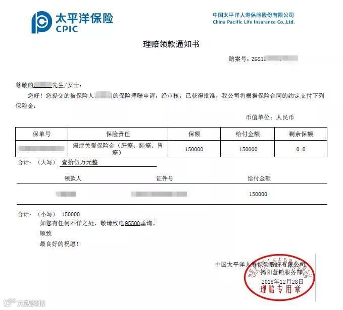 儿子杨先生耐心开导他说:“早年我在太平洋保险公司不是帮你投保了一个防癌险吗?钱都是保险公司赔的,您只管放心去治疗,我们一分钱都不用花”,最终说服了父亲放下包袱,安心去治疗,经过一个月的治疗后出院。