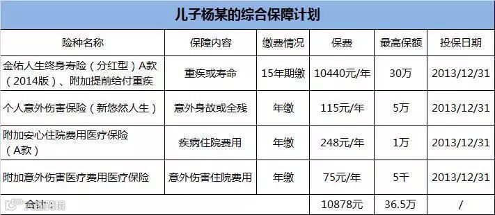 李女士与丈夫杨先生都是80后,早年组建的家庭和睦、幸福养育了一个健康的儿子,有着很强保险意识的她,于2013年在清远中支戴密静业务经理推荐下,作为投保人为14岁的宝贝儿子杨某投保了戴经理设计的保障计划:金佑人生终身寿险(分红型)A款、附加重大疾病保险、附加安心住院医疗保险及个人意外伤害保险。
