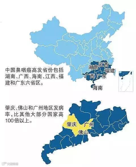 鼻咽癌是一种地方性较强的恶性肿瘤,在我国的发病有南北之分,呈现南高北低的现象。特别是我国南方的六个省,即广东、广西、湖南、江西、海南和福建,鼻咽癌比较高发。