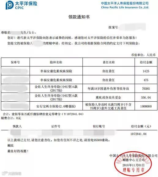 首先,非常感谢太平洋保险公司这般快速温暖的赔付!你们的赔付,是我先生对这个家庭的另一种守护,谢谢你们。