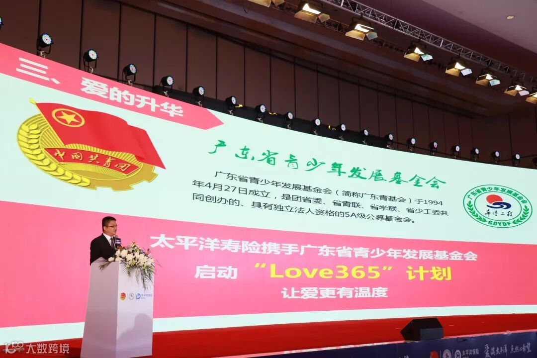 10月10日,由共青团广东省委员会、广东省金融工作办公室、中国保险监督管理委员会广东监管局、广东省保险行业协会指导,中国太保寿险广东分公司、广东省青少年发展基金会联合主办的“爱满太平洋,点燃心希望——Love365计划”启动仪式在东莞举行,共青团广东省省委副书记梁均达、广东保监局、广东省金融工作办公室、广东省保险行业协会、广东省青少年发展基金会、中国太保寿险广东分公司等相关领导出席启动仪式。