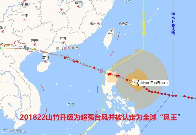 超强台风“山竹”14日11时中心位于距离菲律宾马尼拉偏东方向约600公里的西北太平洋洋面上(距离我市东南方向1270公里)。预计,其将以25公里左右的时速向西偏北方向移动,15日白天移入南海东北部海面,以后趋向粤西和海南东部,并于16日夜间在上述沿海地区登陆。