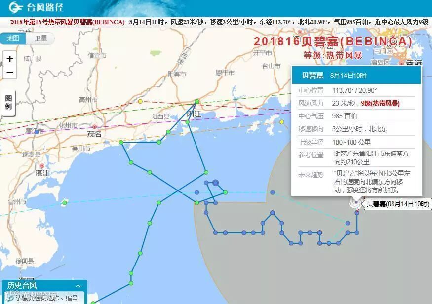 中央气象台已于13日10时发布预警:8月13日上午10时第16号台风正式命名为"贝碧嘉"(热带风暴级)。目前(8月14日10时)台风中心位于阳江市东南方向约210公里的海面上,中心附近最大风力9级,六级大风范围半径约100-180公里。