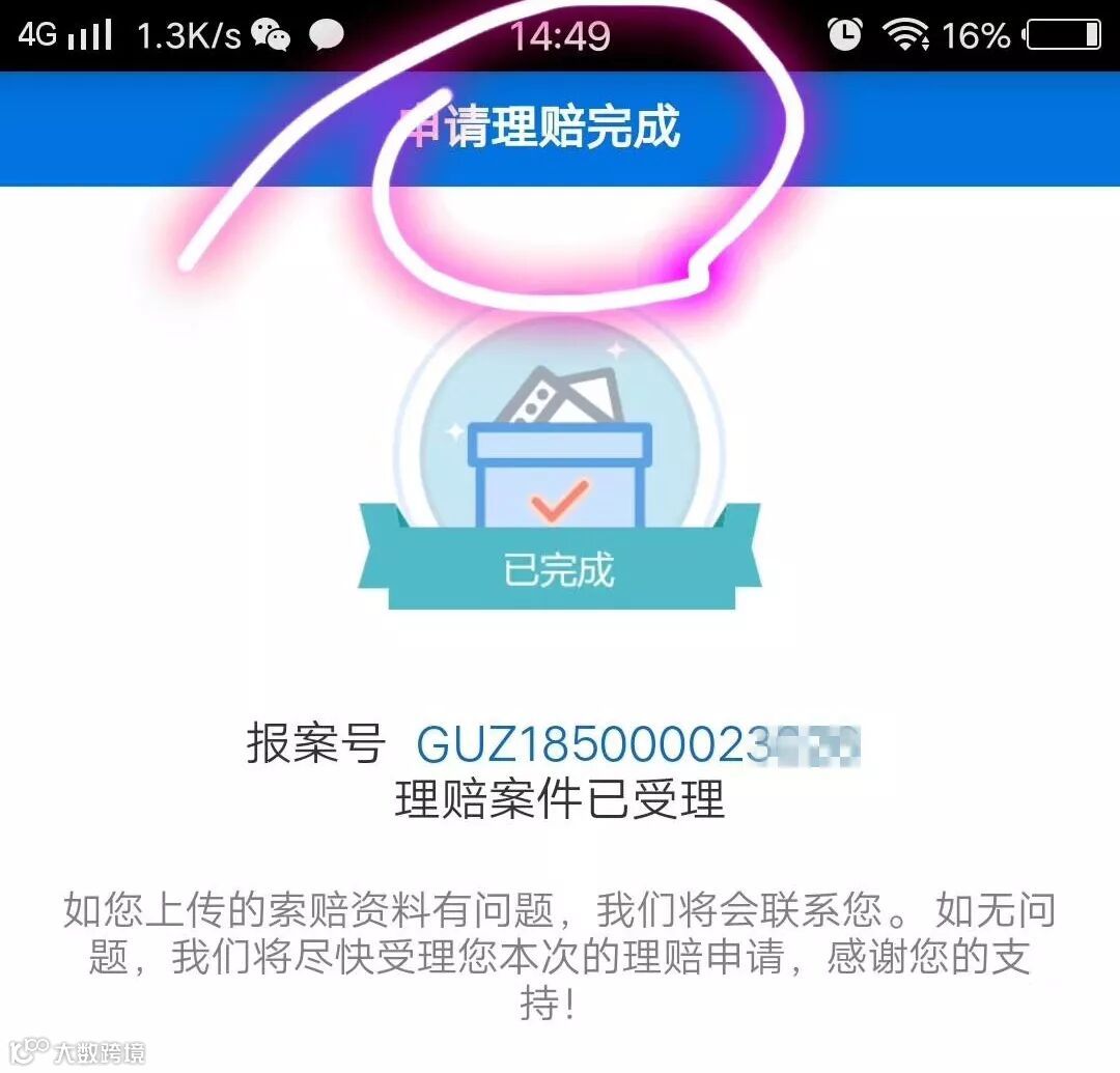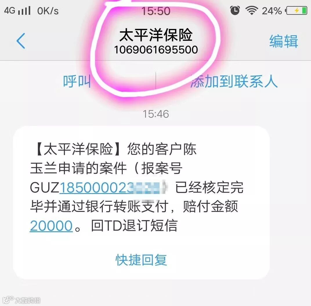 一小时不到,手机就收到了2万理赔款到账的信息!