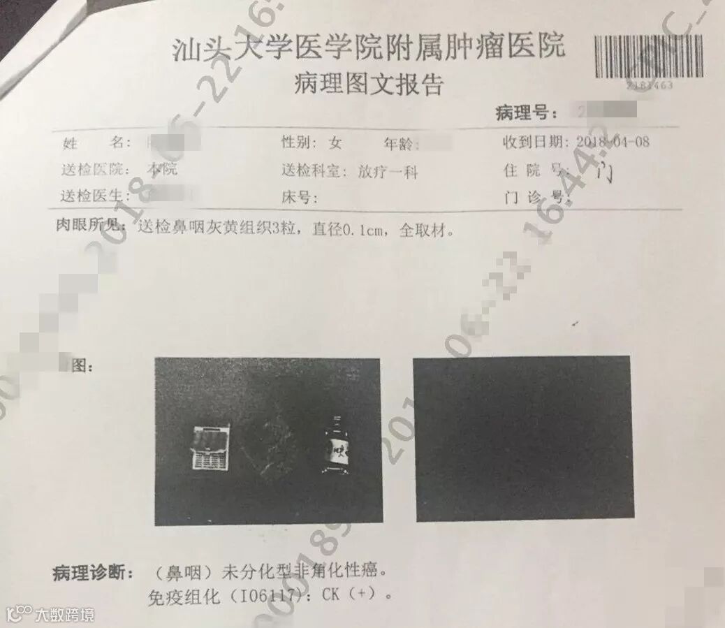 2018年4月8日,马女士在医院门诊完善了一系列检查,两日后便收到了(鼻咽)未分化型非角化性癌的病理报告。大病降临,听从医生的治疗方案,是她此时此刻的唯一选择。