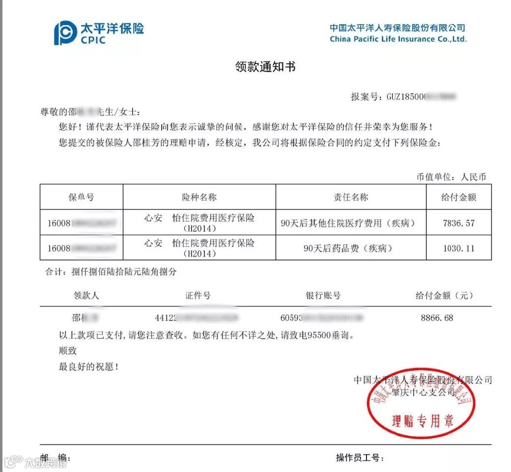 第二天一大早,邵女士的手机就收到了太平洋理赔金到账的提醒,理赔金额为8866.68元,也就是说本次邵女士住院自费部分,心安怡住院费用医疗保险全额理赔!