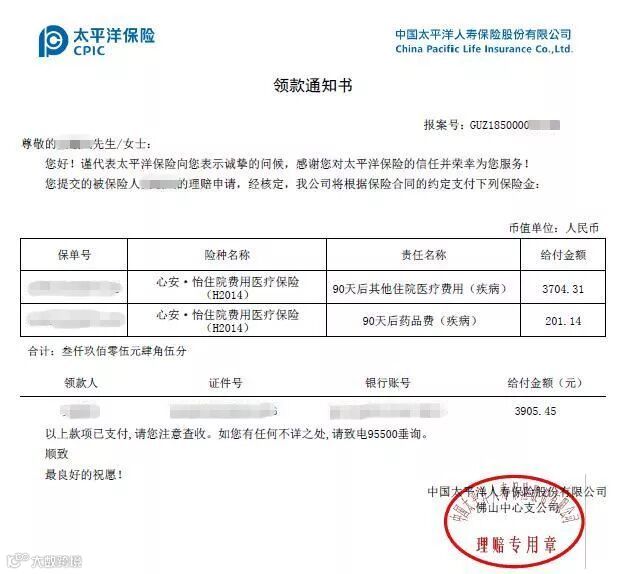 这次住院费用9871.3元,医保报销5965.8元,心安怡赔付了3905.45,不花自己一分钱!李经理真专业,太保产品真棒!