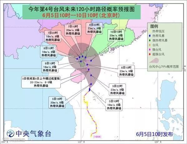 中央气象台已于5日10时发布台风蓝色预警:南海热带低压5日上午8点钟在南海中部海面加强为今年第4号台风(热带风暴级),10点钟其中心位于海南省文昌市以南大约230公里的海面上,就是北纬17.5度、东经111.1度,中心附近最大风力有8级(18米/秒),中心最低气压为996百帕,七级风圈半径100公里, 根据最新实时路径图预测,台风将登陆阳江到徐闻之间沿海地区。