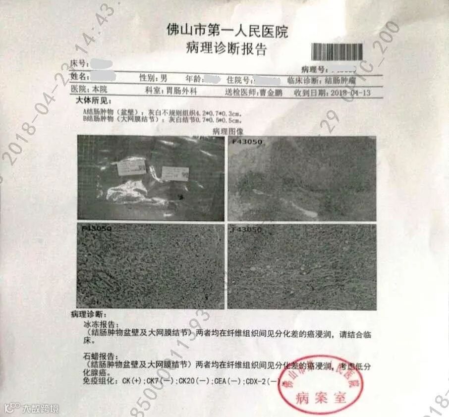 2018年4月17日徐女士爱人因腹痛在佛山市第一人民医院住院,确诊为结肠癌。
