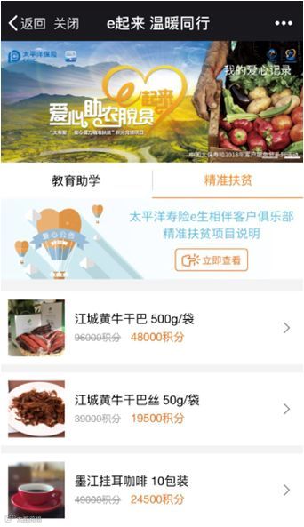 凡是e生相伴客户俱乐部的会员,都可以使用积分兑换精选扶贫商品,并由客户俱乐部按扶贫商品对应价值支付公益资金给贫困地区农民,实现精准扶贫对接。