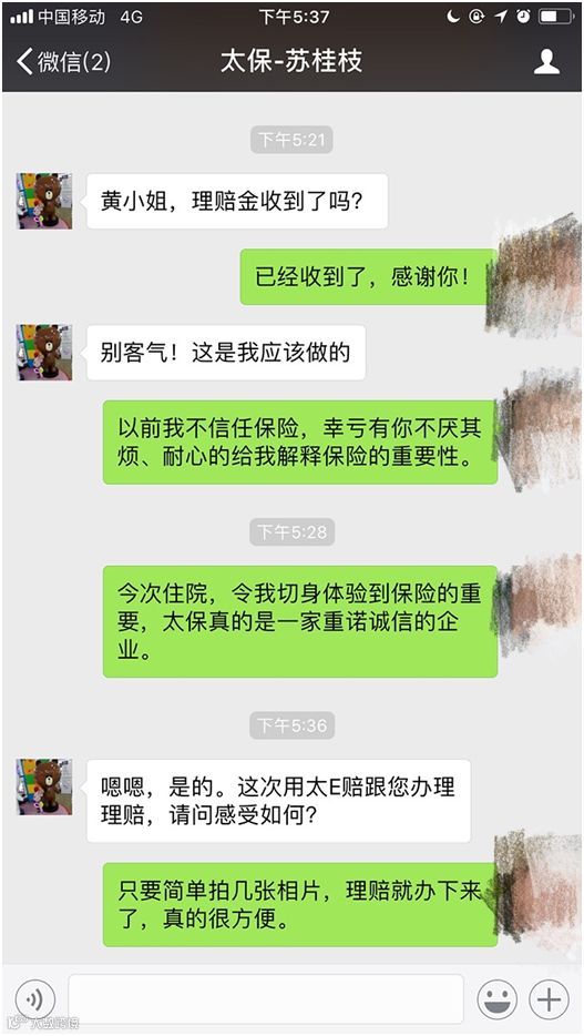 得知黄女士住院治疗结束,江门业务经理苏桂枝亲自前往客户家中,当场使用太e赔办理了理赔,共赔付医疗费5351元。(剔除医保支付后全额给付)