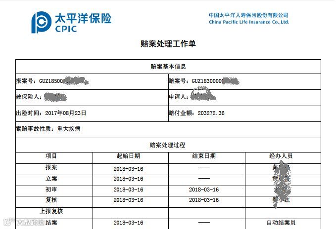2018年3月,刘先生治疗出院了,这才想起在我司投保的金佑人生保险。保单服务人员李经理了解到刘先生的情况后,第一时间赶到刘先生家中,收齐相关资料后递交到公司柜面。2018年3月16日,我司经审核符合重疾赔付条件,当天赔付203272.36元。