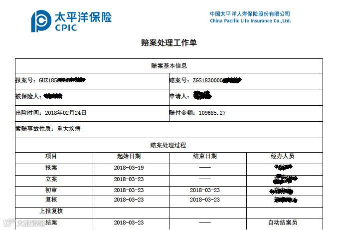 2018年3月23日,我司业务经理林晓聪及调查相关人员上门慰问客户。看过诊断证明书等相关出院资料后,基本确定了此次符合合同条款赔付条件。林经理当即使用手机app,用“太e赔“拍扫客户理赔相关资料申请理赔,1小时赔款到账。