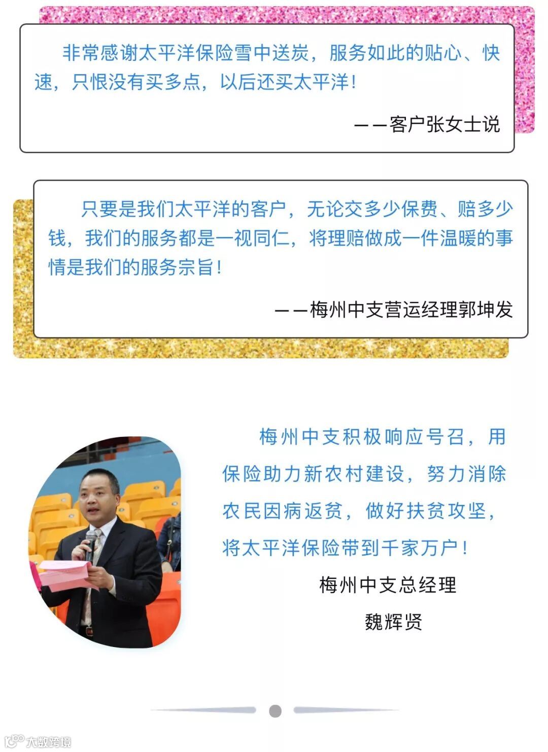 当服务人员告知客户时,客户简直不能相信办理理赔竟然如此贴心、快速!对太平洋保险的理赔服务赞不绝口!郭经理一行再次嘱咐客户要照顾好自己,并提醒客户留意到帐短信便离开了。