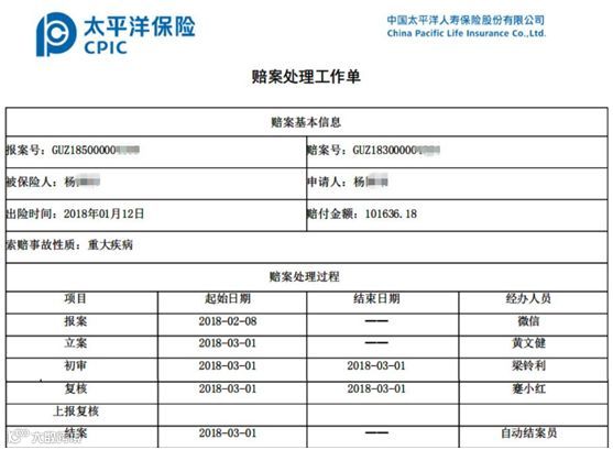 2018年3月1日,杨先生将准备好的理赔申请和资料递交至公司,公司当天审核通过,10万余元理赔金即刻到帐!
