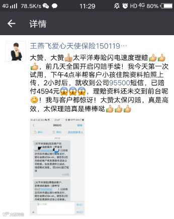 大赞!太e赔真是闪电速度!下午四点半帮客户拍照上传住院资料,不到两小时,就收到赔款到账信息。资料还没交到公司前台呢,这速度太高效了!太保理赔真是棒棒哒!