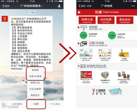 关注“广州地铁微服务”公众号——点击购票——选择“单程票”或者“日票/羊城通”——根据所需进行购票。