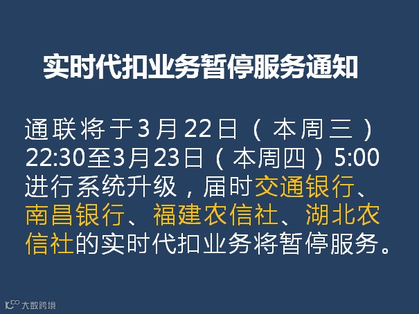 3月22日22:30至23日5:00进行系统升级,届时交通银行、南昌银行、福建农信社、湖北农信社的实时代扣业务将暂停服务!