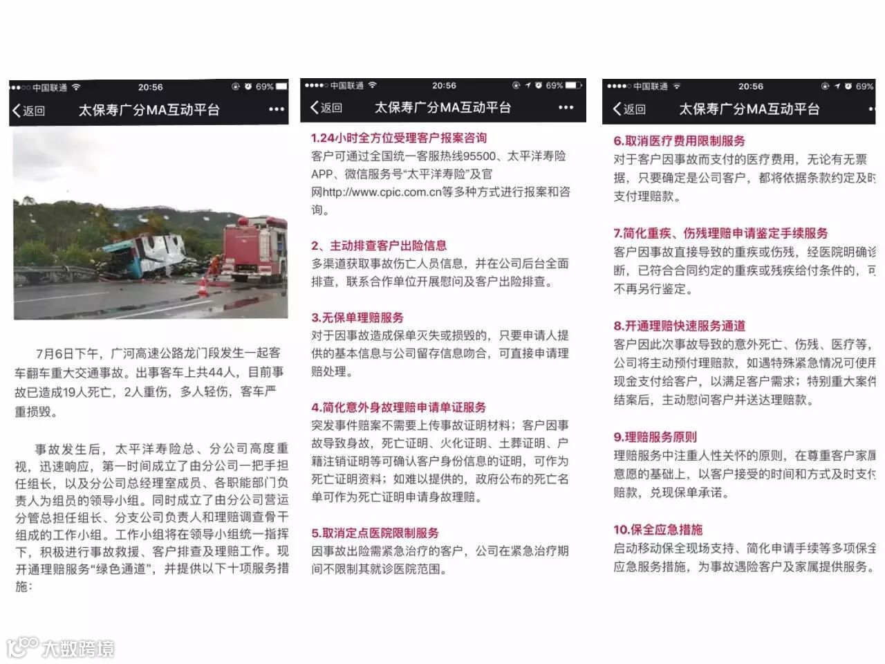 事故发生后,太平洋寿险总、分公司高度重视,迅速响应,第一时间成立了领导小组和工作小组,积极进行事故救援、客户排查及理赔工作,即时开通了理赔服务“绿色通道”,提供十项服务措施。