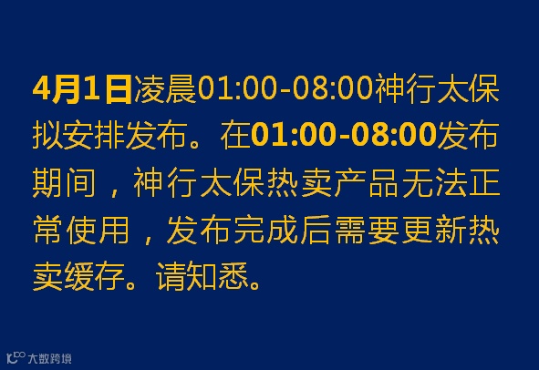 导读:4月1日01:00-08:00神行太保拟安排发布。在01:00-08:00发布期间,神行太保热卖产品无法正常使用,发布完成后需要更新热卖缓存。请知悉。