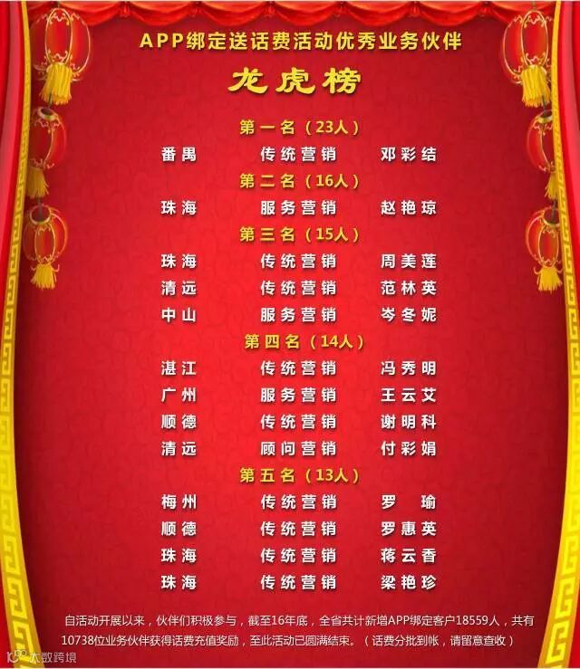 各位伙伴,APP绑定送话费活动已经圆满结束,全省共有10738位业务伙伴获得话费奖励。其中来自番禺的邓彩结等13位伙伴在绑定活动中名列前茅,成为APP推广标杆,在此予以通报表扬!并向所有获奖的业务伙伴表示祝贺希望伙伴们能再接再厉,业绩、APP双丰收!(话费将分批分次到账,请耐心等待)