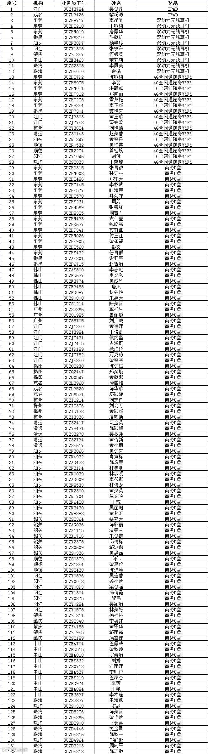 小伙伴们,第一期“低碳服务“太平洋寿险APP、官微绑定及微信电子信函订阅普及活动中奖名单公布啦!共有132名伙伴获得奖品!