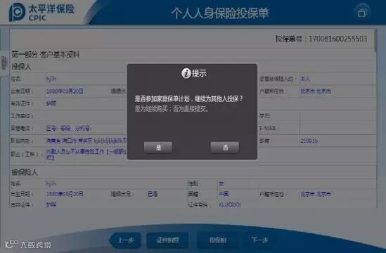 电子投保单页面点击“下一步”时弹出提示框: