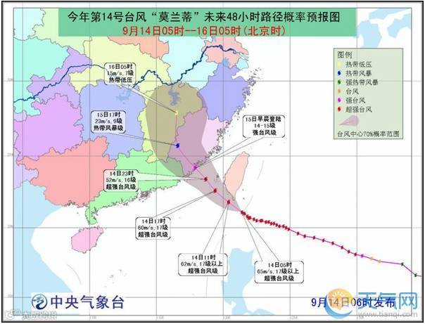中秋节临近,今日(9月14日)中央气象台宣布,今年“莫兰蒂”号台风将于14日白天掠过台湾东南部,15日凌晨到上午在福建厦门到广东汕尾一带沿海登陆(14~15级,强台风级),受其影响,14日至17日,广东东部将有大暴雨,局地有特大暴雨(累计雨量250~450毫米);广东东部沿海等地风力将逐渐加大到8~10级,部分海域或地区风力有12~15级,局部海域可达17级以上。