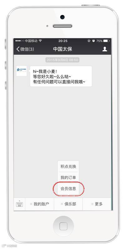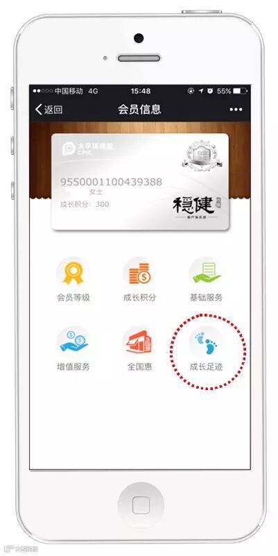 打开【中国太保】官方微信,屏幕下方点击【俱乐部】进入【会员信息】,选择【成长足迹】