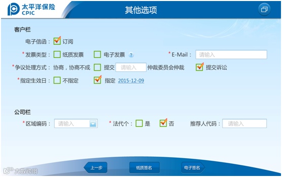 “保费代扣账户”页面后新增“其他选项”页面,页面内容分为客户栏和公司栏,客户栏由客户自已填写,公司栏由业务员填写。