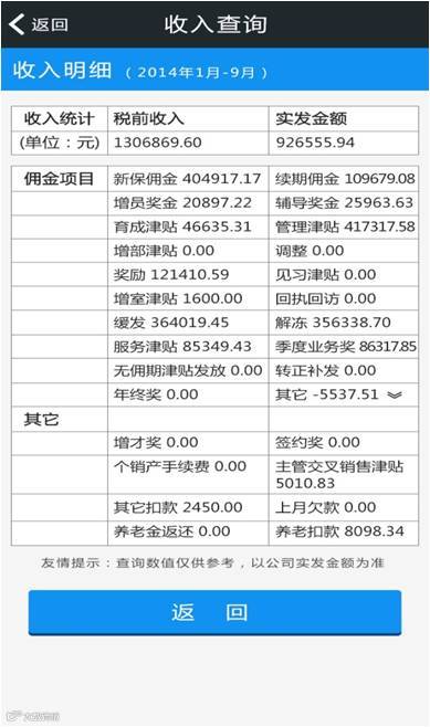 2.在收入查询中,可以清楚看到收入金额、往期同比、分/总公司平均收入、打败多少同职级层业务伙伴等详细信息。