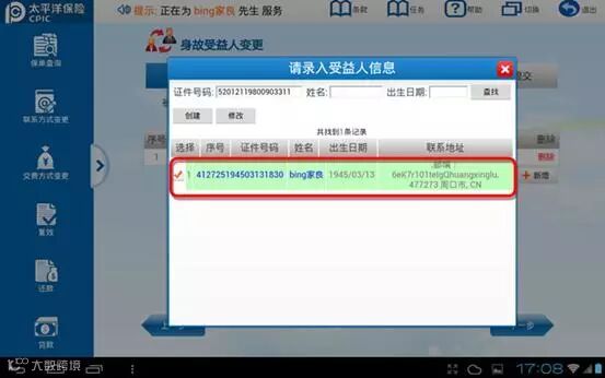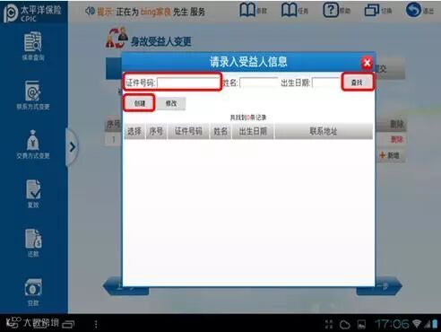 (六)录入“证件号码”后点击“查找”系统是否有受益人信息,若无,点击“创建”创建新受益人信息。