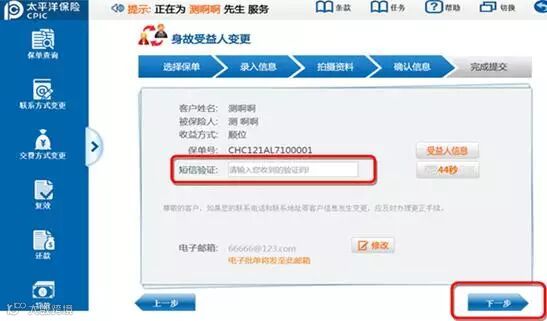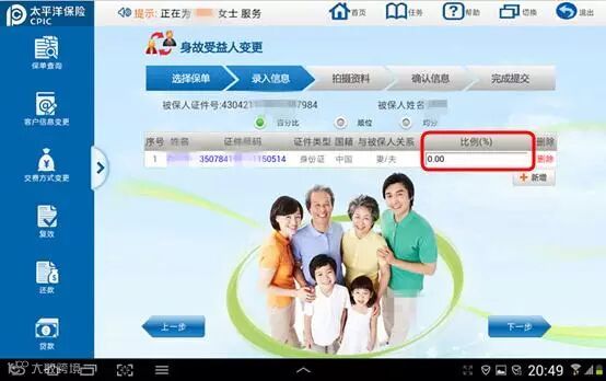 (十一)拍摄照片,要根据业务提示拍摄,包括拍摄被保人及受益人相关资料。如受益人较多时,手势向上滑动,依次点击对应的提示框拍摄,全拍摄完毕后点击“下一步”。