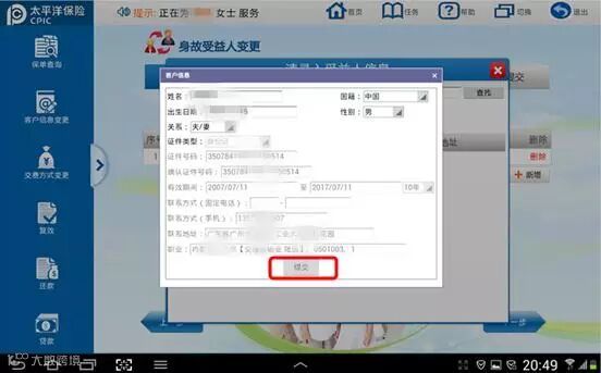 (七)完善受益人信息。除联系方式(固定电话)可不填写外,其他均是必填项。填写完毕后,点击“提交”。