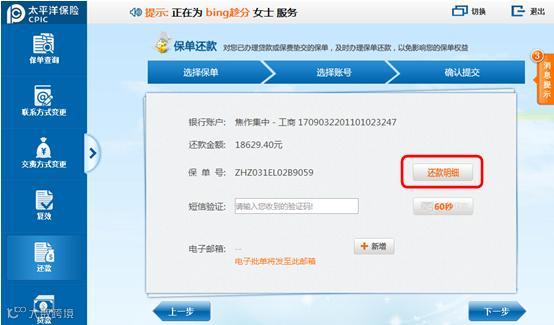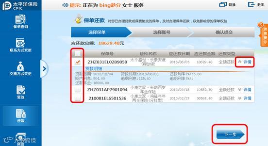 2、勾选要办理还款的保单(点击“详情”可以查看详细信息),点击“下一步”: