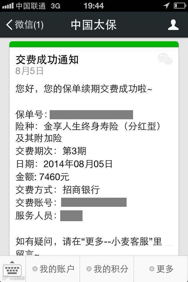 2014年7月以来,【中国太保】陆续上线“续期交费通知”、“交费成功通知”和“客户积分变化通知”三大