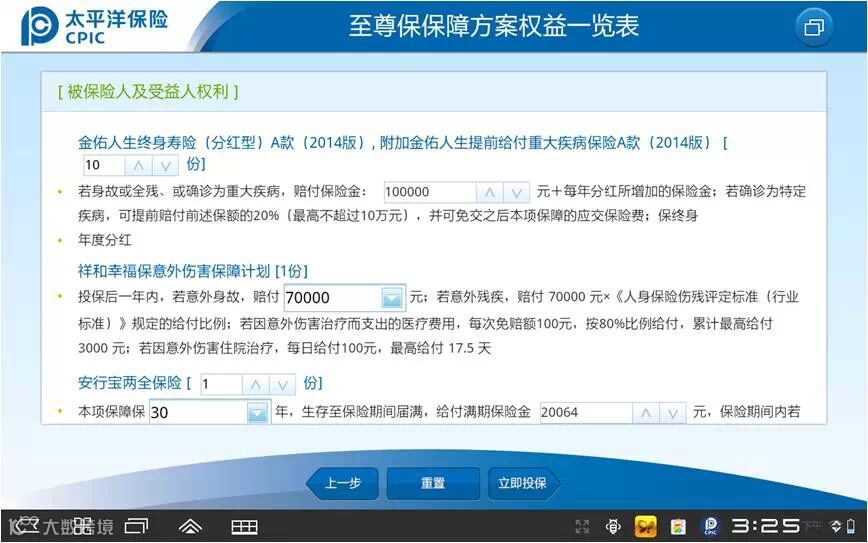 选择“超级保”或“至尊保”,点击“下一步”进入“超级保/至尊保保障方案权益一览表”,可按需进行份数/保额、交费年限等调整。调整完成,点击“立即投保”,一站式完成投保流程。