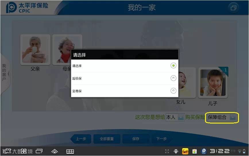 点击“量体裁衣”APP进入“我的一家”页面,输入投、被保险人信息,选择被保险人,系统校验被保险人若符合“超级保”及/或“至尊保”购买条件,界面显示“保障组合”下拉框。