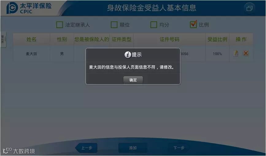 4、神行太保来为您把关,瞧,系统会将受益人信息和之前填写的投保人信息进行校验,马上提示您进行修改!