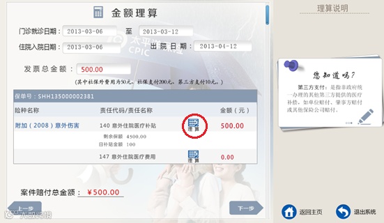 账单录入完成后,点击“下一步”按钮,可进入理算界面。理算用记险种公式不?当然不,移动理赔可以做到一键理算哦。点击界面中的“理算”按钮,就可显示赔付金额。每个险种责任的理算说明以及最终的案件理赔给付金额,都一目了然。让你的客户明明白白理赔,有木有!!