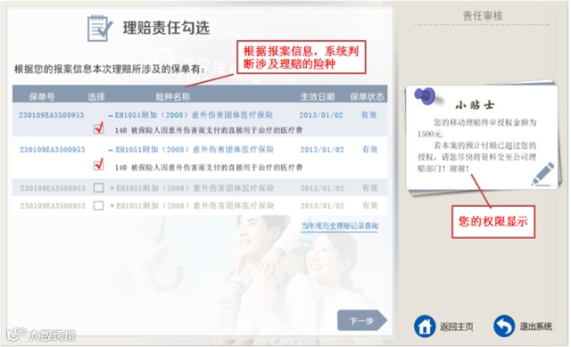 害怕理赔责任审核太专业?担心责任勾选错误?一进入现场审核,“移动理赔”已经根据你之前的报案信息匹配好了客户本次可以赔付的险种责任哦!红色勾选的是本次可赔付,灰暗的表示本次不能赔付。很清晰滴有木有?!