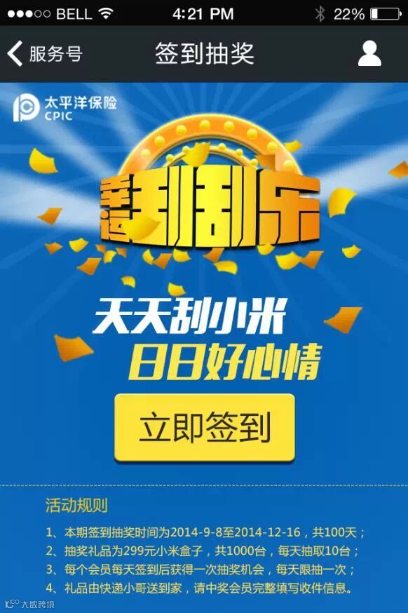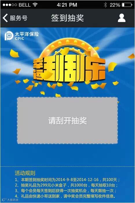 太平洋寿险广东分公司自9月8日起,凡是太保俱乐部会员,签到就能刮奖赢小米哦!