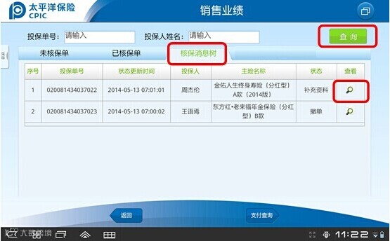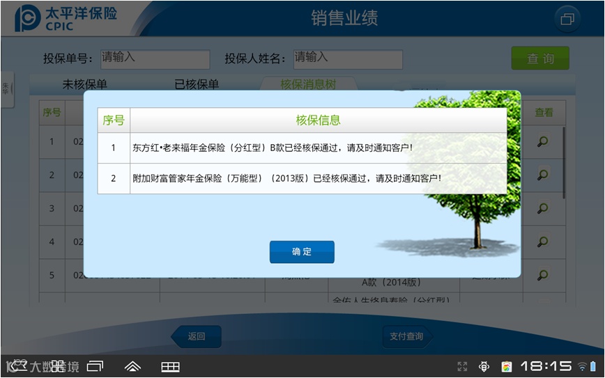 点击应用商店页面下方的“销售业绩”,进入销售业绩,在“已核保单”右边增加了“核保消息树”按钮。点“核保消息树”,再点“查询”,如果转核保件已有处理信息,就会在下方按照信息行的方式展示出来。