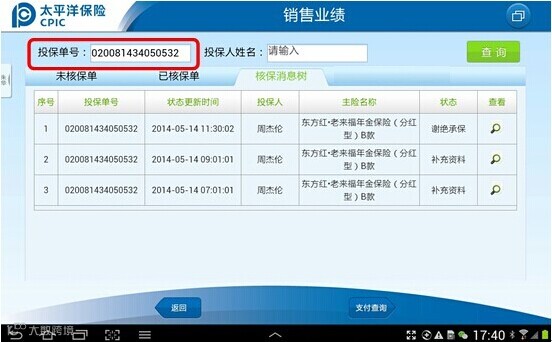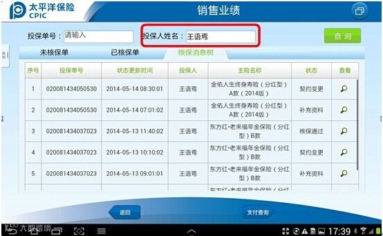 在“投保人姓名”栏输入要查询的投保人姓名,点“查询”按钮,将会显示其作为投保人投保的各个保单的核保过程信息。