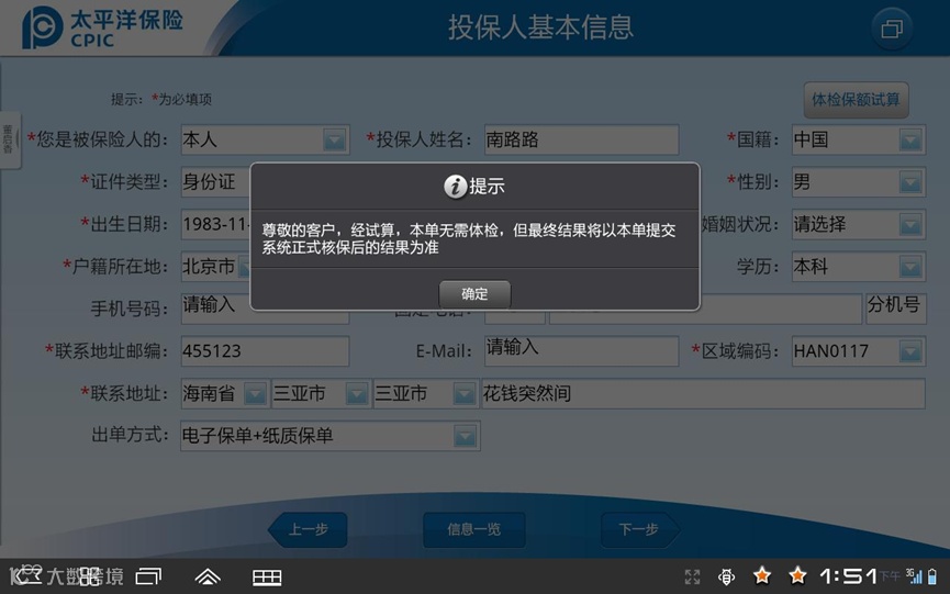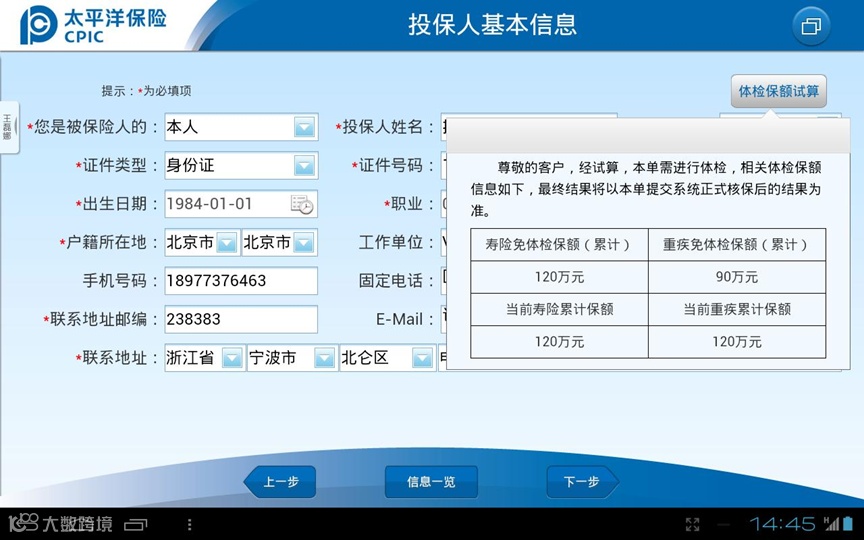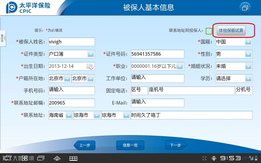 投被保险人为同一人时,可以点“投保人基本信息”界面右上角的“体检保额试算”键进行试算。
