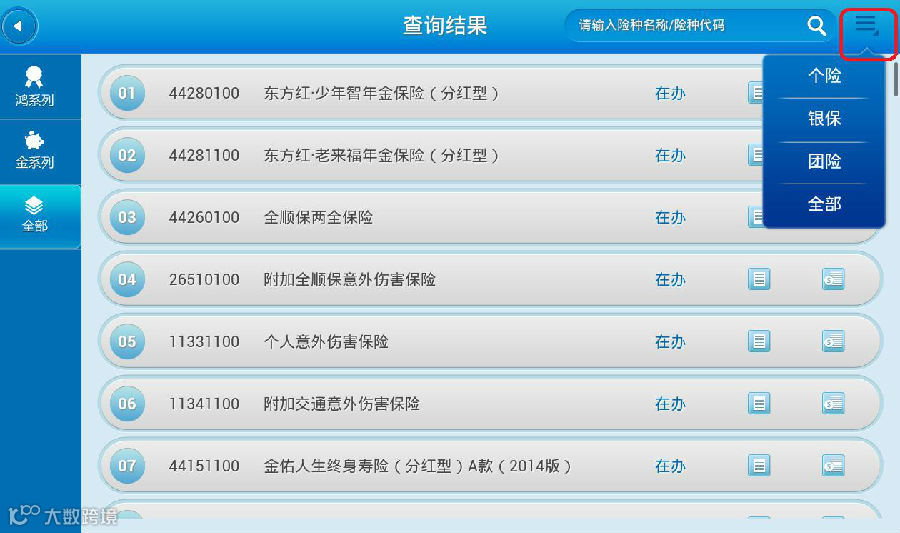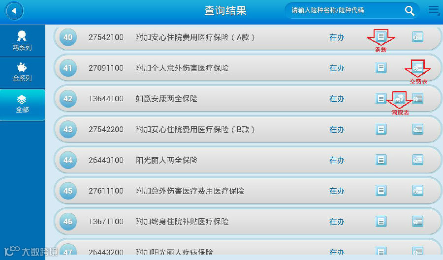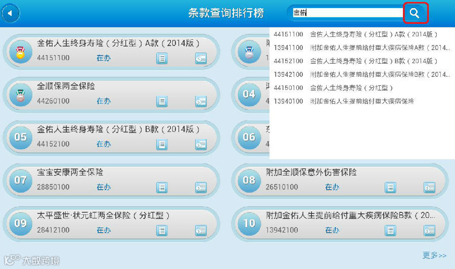 2.条款库首页按下载率从高到低显示前十位的保险产品,点击“更多”可查看更多的险种。